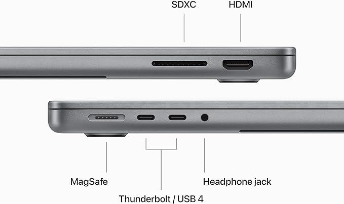 • قم بتوصيل كل شيء — يتميز جهاز MacBook Pro هذا بمنفذ شحن MagSafe، ومنفذين Thunderbolt / USB 4، وفتحة بطاقة SDXC، ومنفذ HDMI، ومقبس سماعة رأس. استمتع باتصال لاسلكي سريع مع Wi-Fi 6E وBluetooth 5.3. يدعم شاشة خارجية واحدة. (يتوفر Wi-Fi 6E في البلدان والمناطق التي تدعمه.)